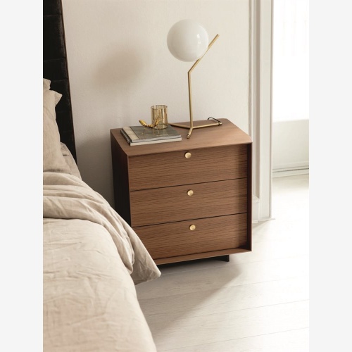 Прикроватная тумба с тремя выдвижными ящиками. Фасады ящиков из дерева, кожи или зеркала Fume. Опора в отделке бронза. Внутри ящики облицованы орехом каналетта.