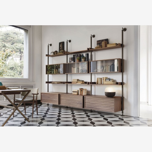 Подставка под телевизор с металлической структурой с использованием различных аксессуаров из стекла или дерева.
