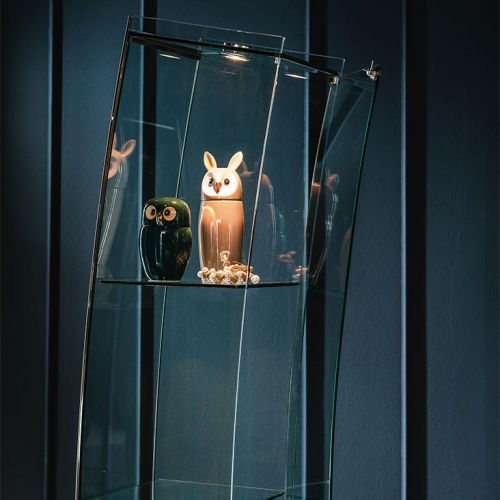 Витрина из прозрачного стекла с изогнутыми дверью и спинкой и стальными деталями.